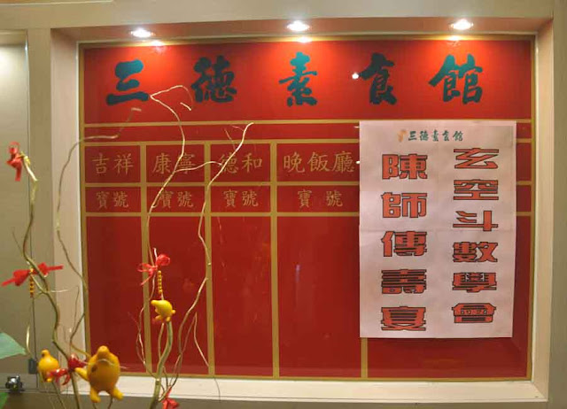 七時多離開學會,乘車至北角三德素食舘,這晚,四席全滿,包廂。廂房內,掛滿了當晚的書法作品,真箇是琳瑯滿目了。